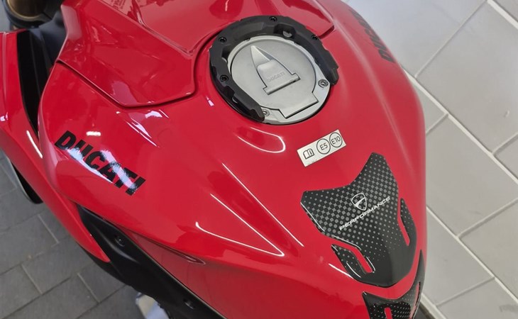 Inklusive zugelassenem Termignoni Endschalldämpfer, Handhebel Ducati by Rizoma, kurzes Heck mit integrierten Blinkern, Tankpad.