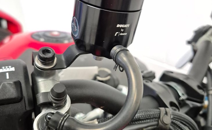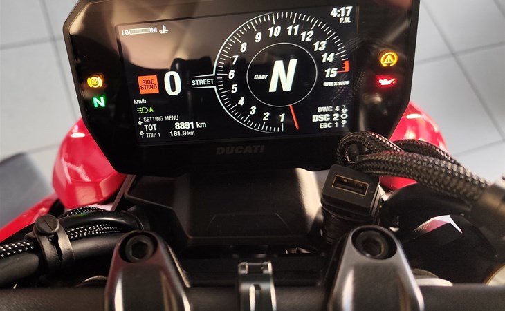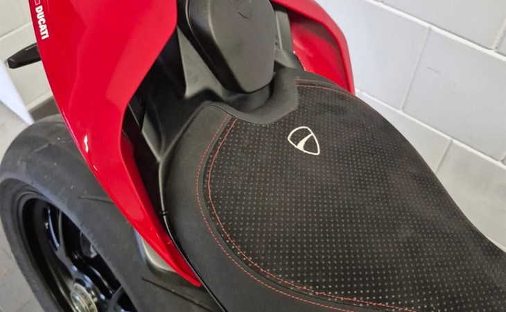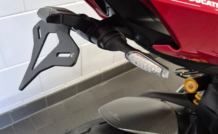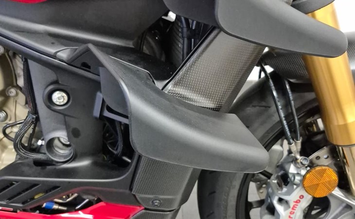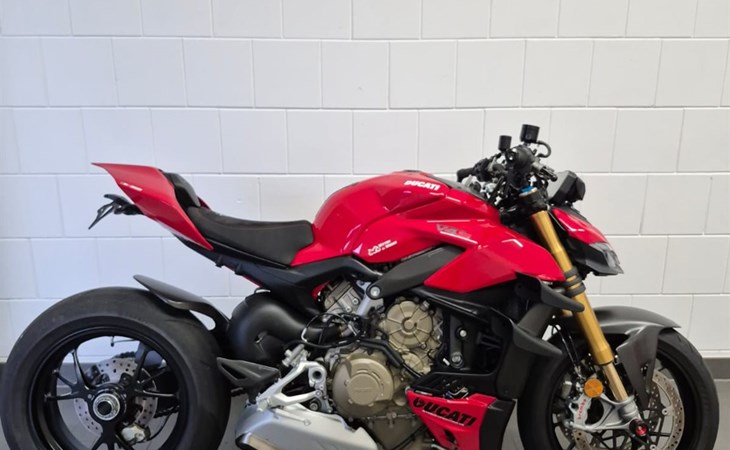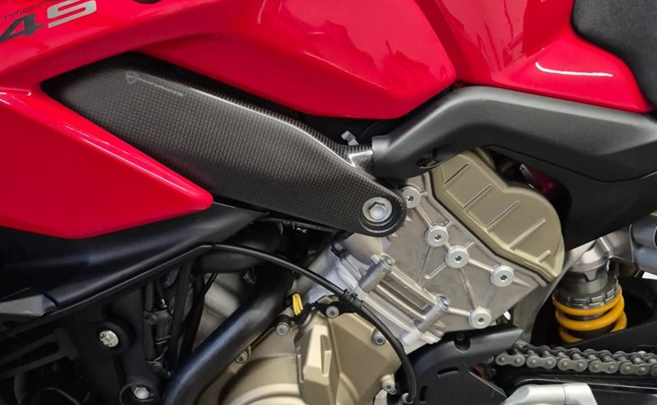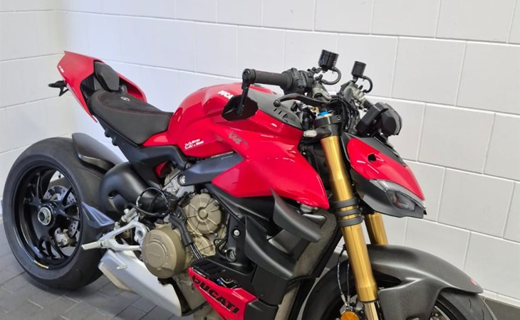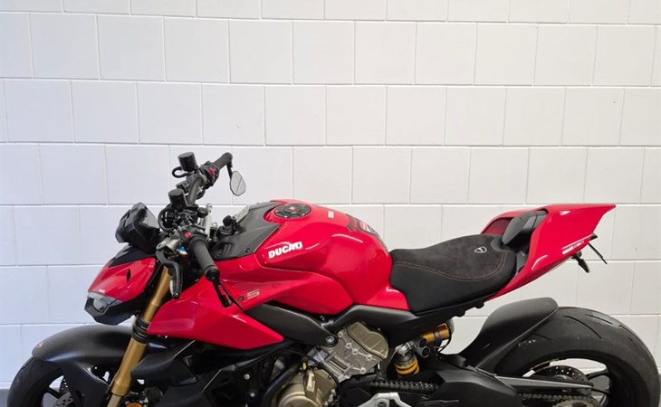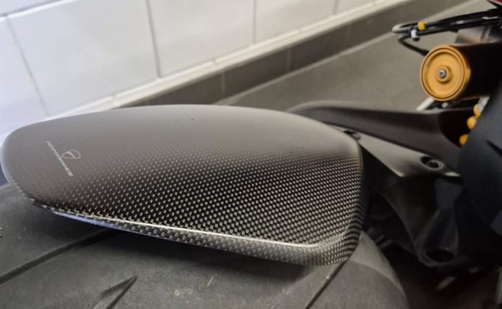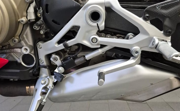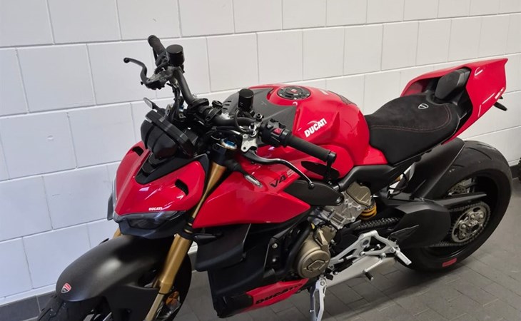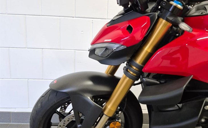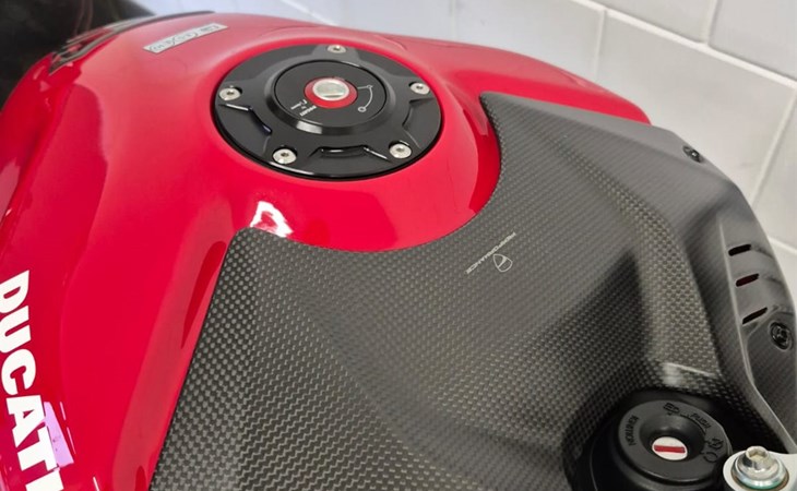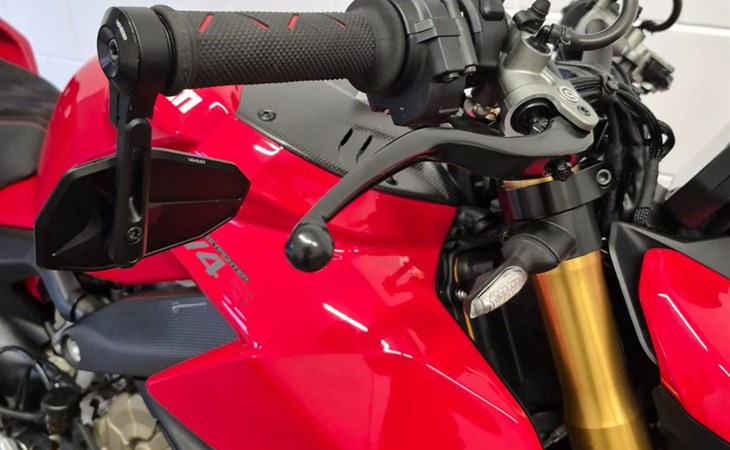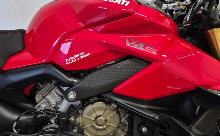 Sehr schöner Streetfighter V4S inklusive kurzem Heck mit LED Blinkern, Kohlefaser Kotflügel vorne und hinten, Kohlefaser Tankabdeckung, Kohlefaser Kühlerblenden, Performance Sitz, Lenkerendspiegel, gefräste Brems- und Kupplungsflüssigkeitsbehälter am Lenker, Achsschutz vorne, Performance Griffgummis, Performance Tankdeckel.